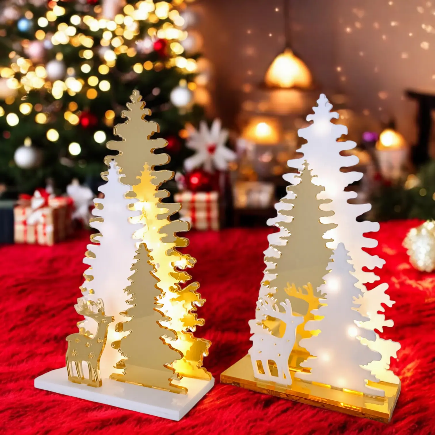 Estas lámparas están diseñadas para capturar el espíritu navideño. El acrílico blanco proporciona una base elegante y moderna, mientras que los detalles en dorado añaden un toque de lujo y calidez. La precisión del corte láser permite crear escenas detalladas y complejas que evocan la magia y la alegría de la temporada navideña.